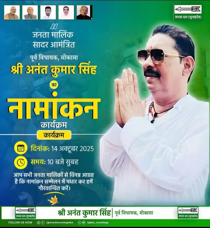 छोटे सरकार के नाम से मशहूर अनंत सिंह ने सोशल मीडिया पर पोस्ट करते हुए नॉमिनेशन तक की तारीख बता दी है. उन्होंने कहा है कि “लोकतंत्र के महापर्व में मोकामा विधानसभा क्षेत्र 178 से हमारे नामांकन में आप सभी जनता मालिक सादर आमंत्रित है. यह हमारे लिए गौरव और संकल्प की बेला है. आप सभी जनता मालिक और समर्थकों से विनम्र निवेदन है, अपना आशीर्वाद, स्नेह और समर्थन अवश्य प्रदान करें ताकि यह यात्रा जनहित और न्याय के मार्ग पर सफल हो सके”.